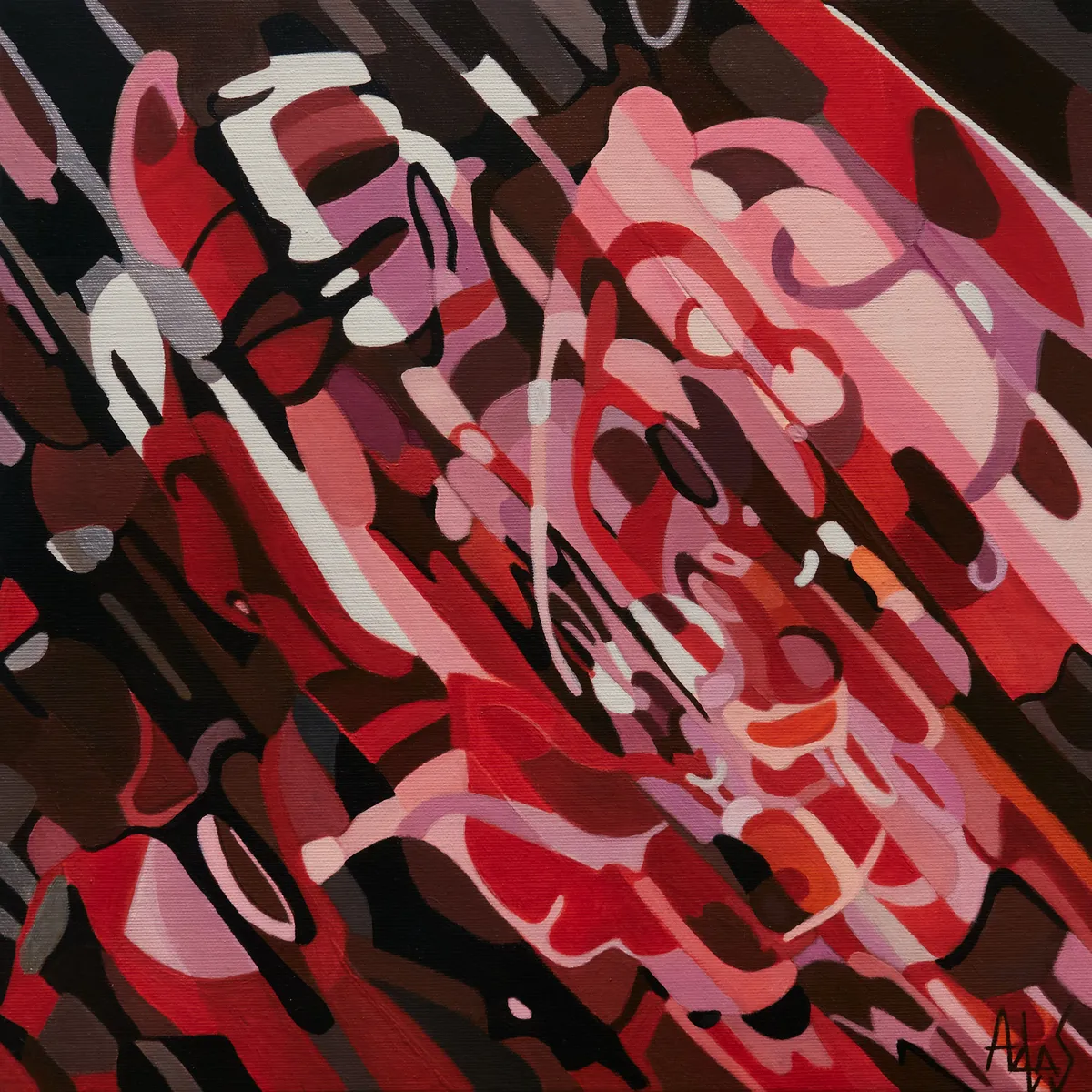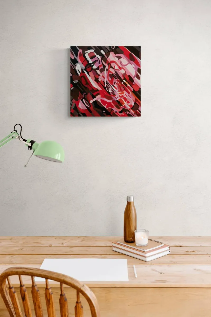 It is hard to miss the titular character in this piece, but once we move on we discover a veritable panoply of shapes and forms which hint at deconstructed figures caught in a maelstrom. The whirling eddies of autumnal winds? Change is in the air, shadows dance across the surface - the artist has left us with a story to unravel, discover and write. Painted with acrylic paint on a deep 3.5cm stretched canvas - the painting wraps around the sides of the canvas allowing the painting to be hung directly without framing.