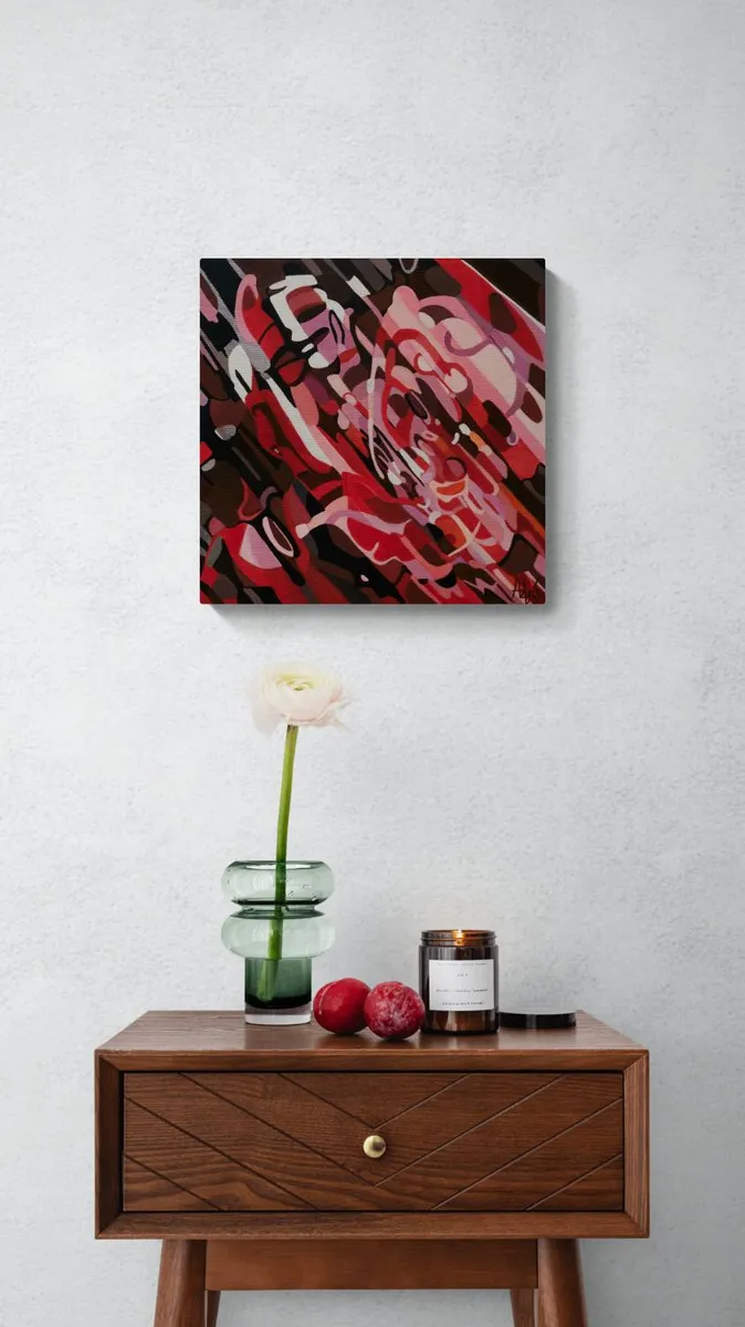 A riot of colour impacts us first and foremost, but after the initial overwhelming of the senses dies down, we find ourselves drawn into a multi-faceted work. Layers and lines fold in on themselves playing with our sense of perspective, but one can't help but feel joy and love radiating from the inside out. Painted with acrylic paint on a deep 3.5cm stretched canvas - the painting wraps around the sides of the canvas allowing the painting to be hung directly without framing.