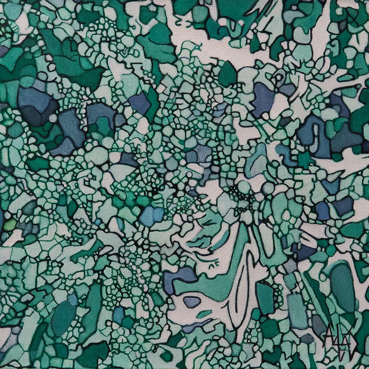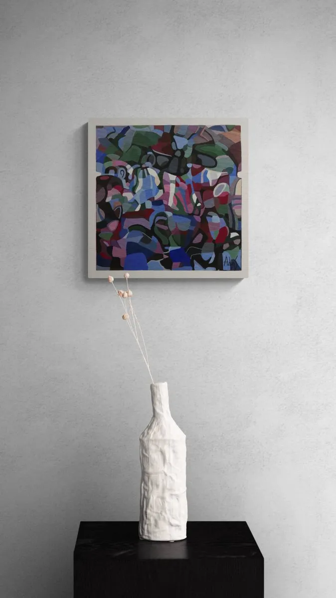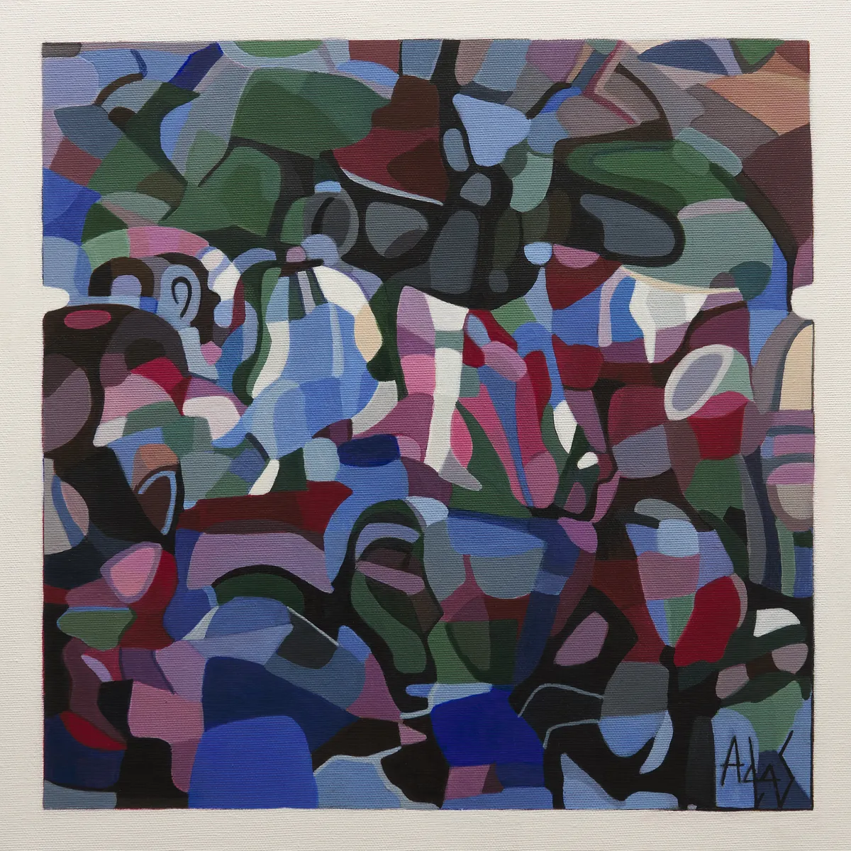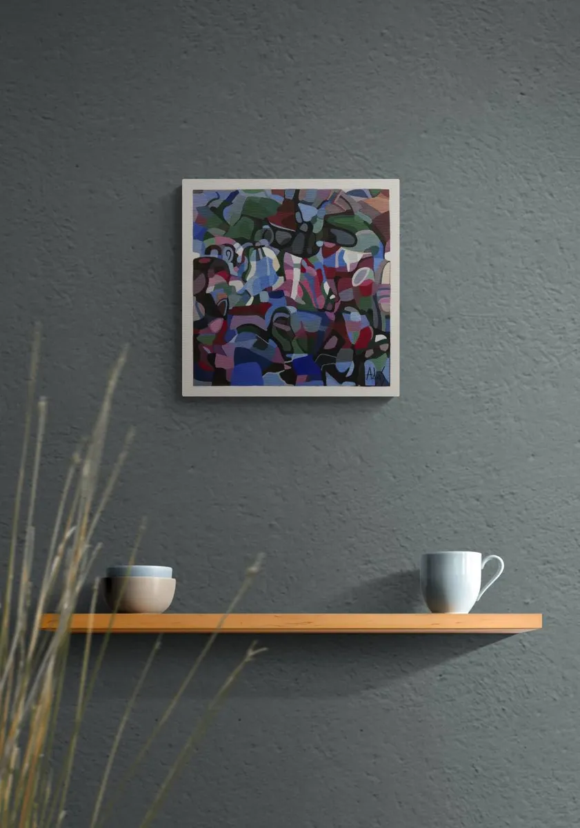 This work marks the artist's first experimentation with acrylic ink as a medium, perhaps resulting in a more primary palette which intertwines, melds and blends together. Any figures that might be present are perfectly camouflaged as the proverbial chameleon might be. Painted with acrylic ink on a deep 3.5cm stretched canvas - the painting wraps around the sides of the canvas allowing the painting to be hung directly without framing.