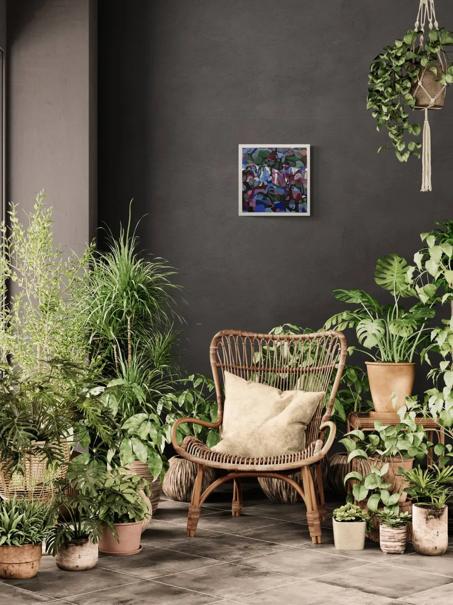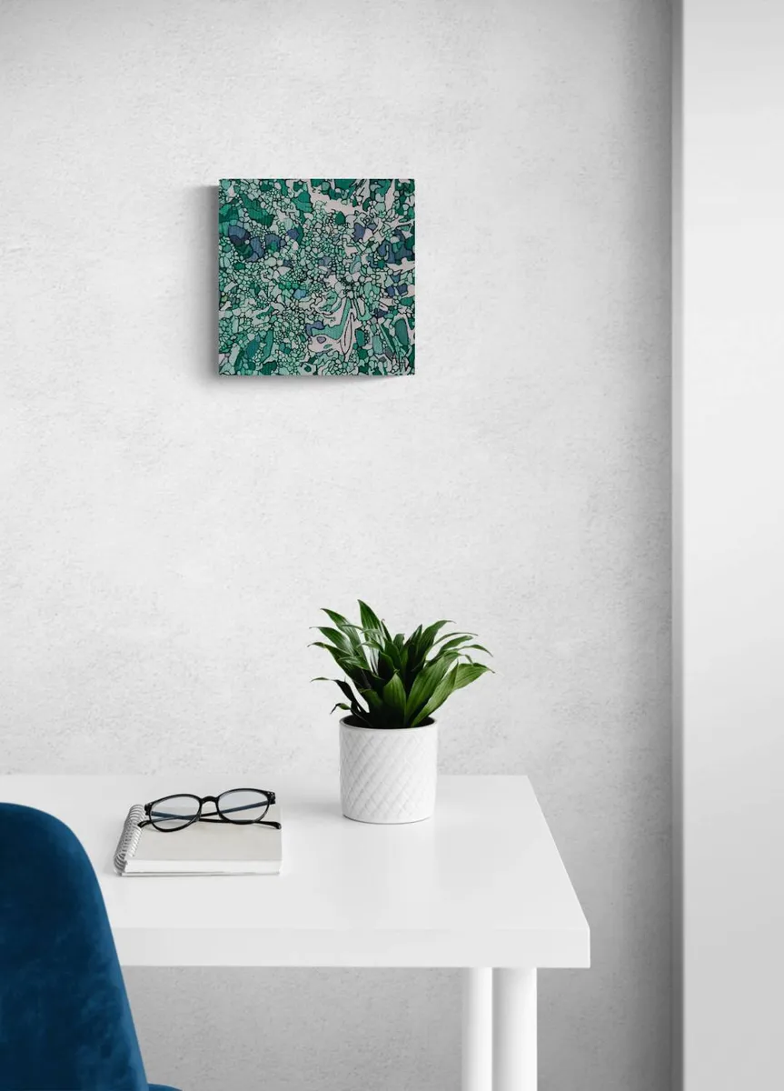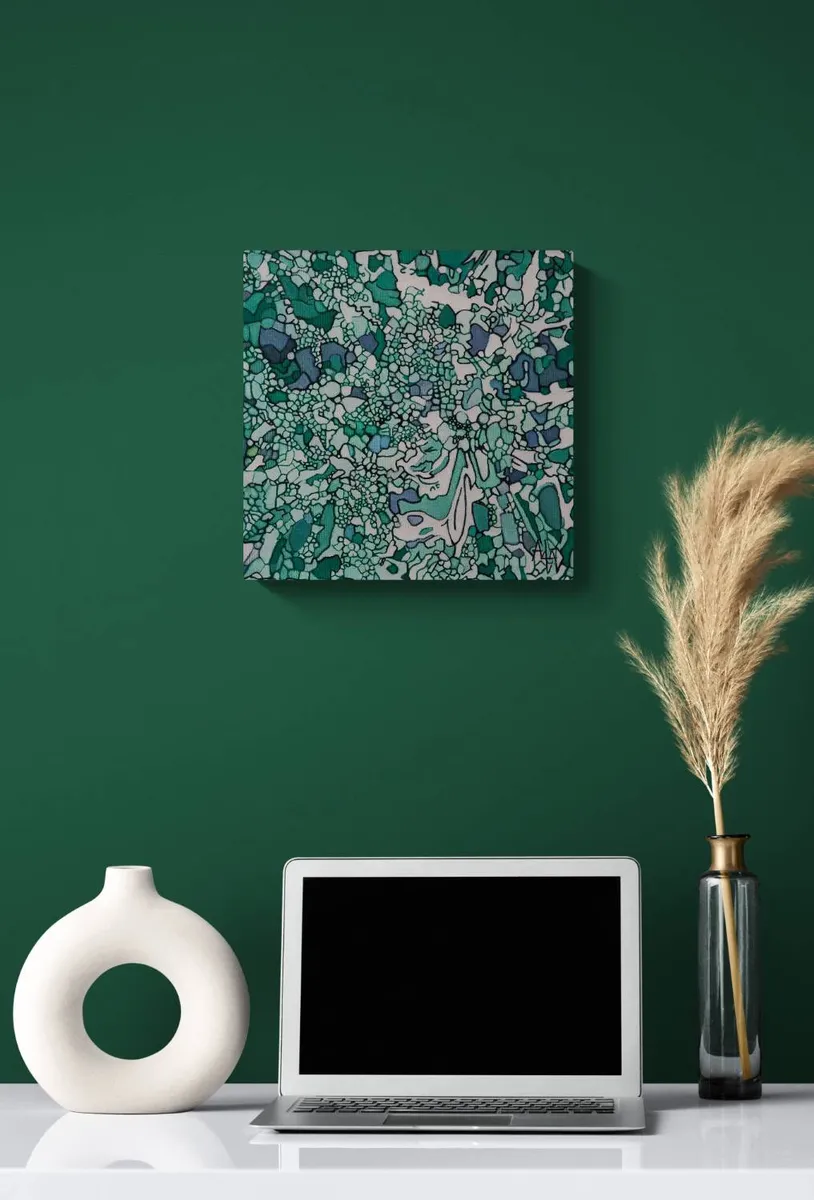 This work marks the artist's first experimentation with acrylic ink as a medium, perhaps resulting in a more primary palette which intertwines, melds and blends together. Any figures that might be present are perfectly camouflaged as the proverbial chameleon might be. Painted with acrylic ink on a deep 3.5cm stretched canvas - the painting wraps around the sides of the canvas allowing the painting to be hung directly without framing.