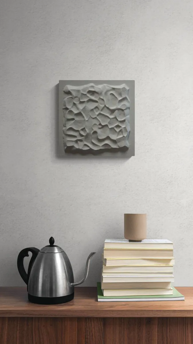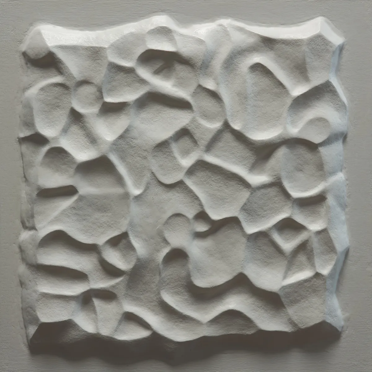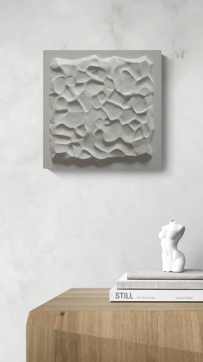 A beautiful textured work which blurs the line between painting and sculpture - a work which shifts and alters as the light changes throughout the day. A mixed media work using modelling clay and other material on a wooden board and painted with gouache.