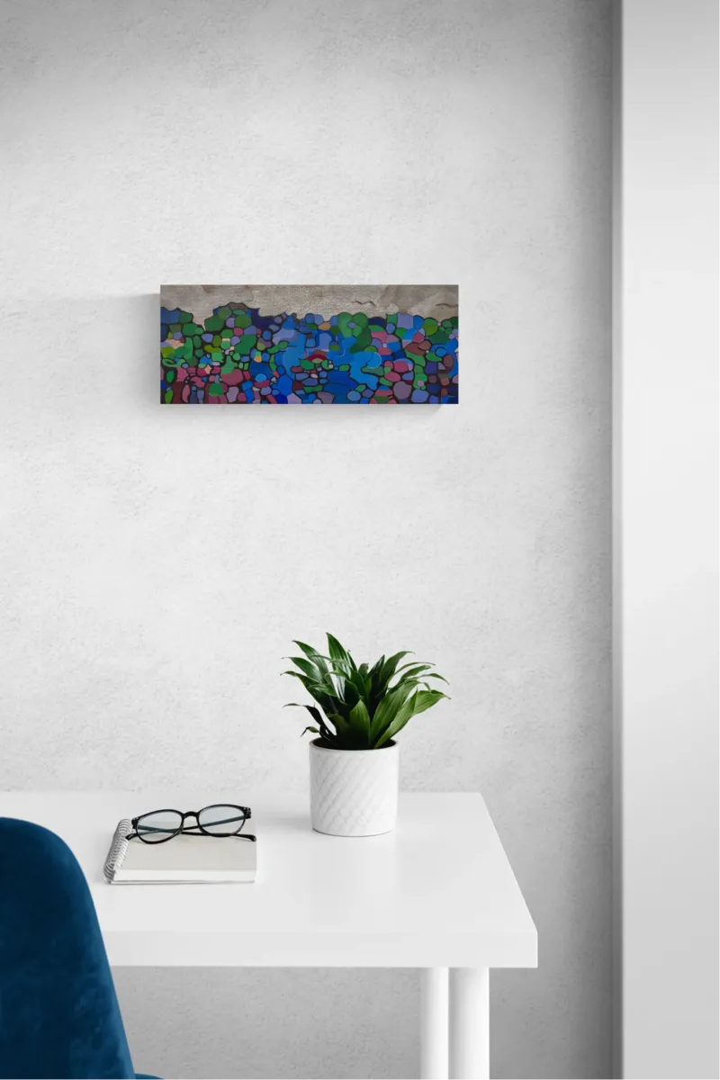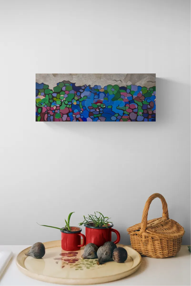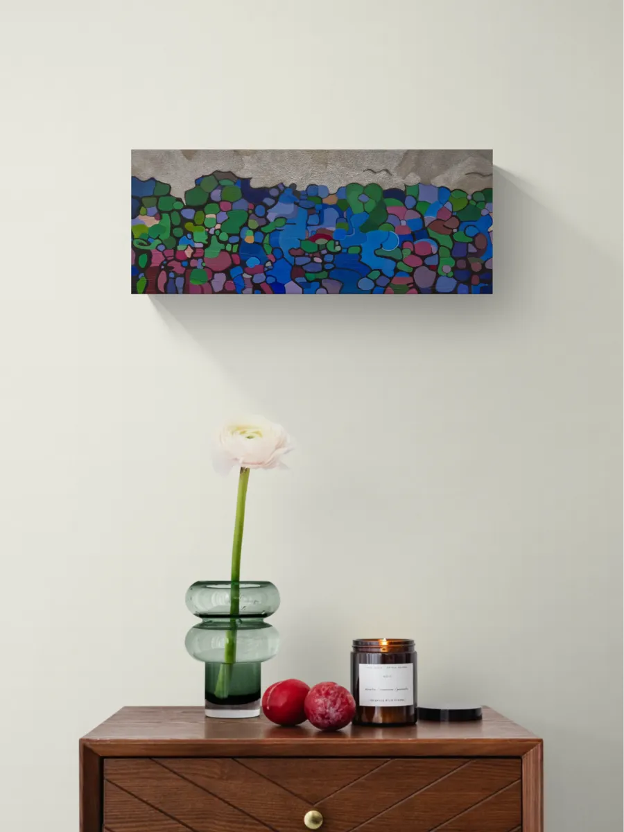 Painted with acrylic ink on a deep 3.5cm stretched canvas - the painting wraps around the sides of the canvas allowing the painting to be hung directly without framing.