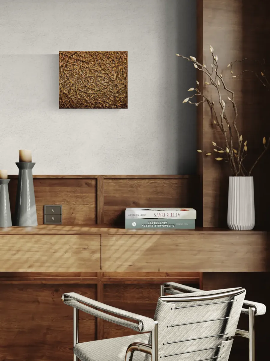 A mixed media work using modelling clay and other material on a wooden board and additional mixed media texture to provide a sort of modern relief work, finished with a variety of oxidised gold and copper leaf. The work is 30x25cm and reaches a depth of around 4cm.