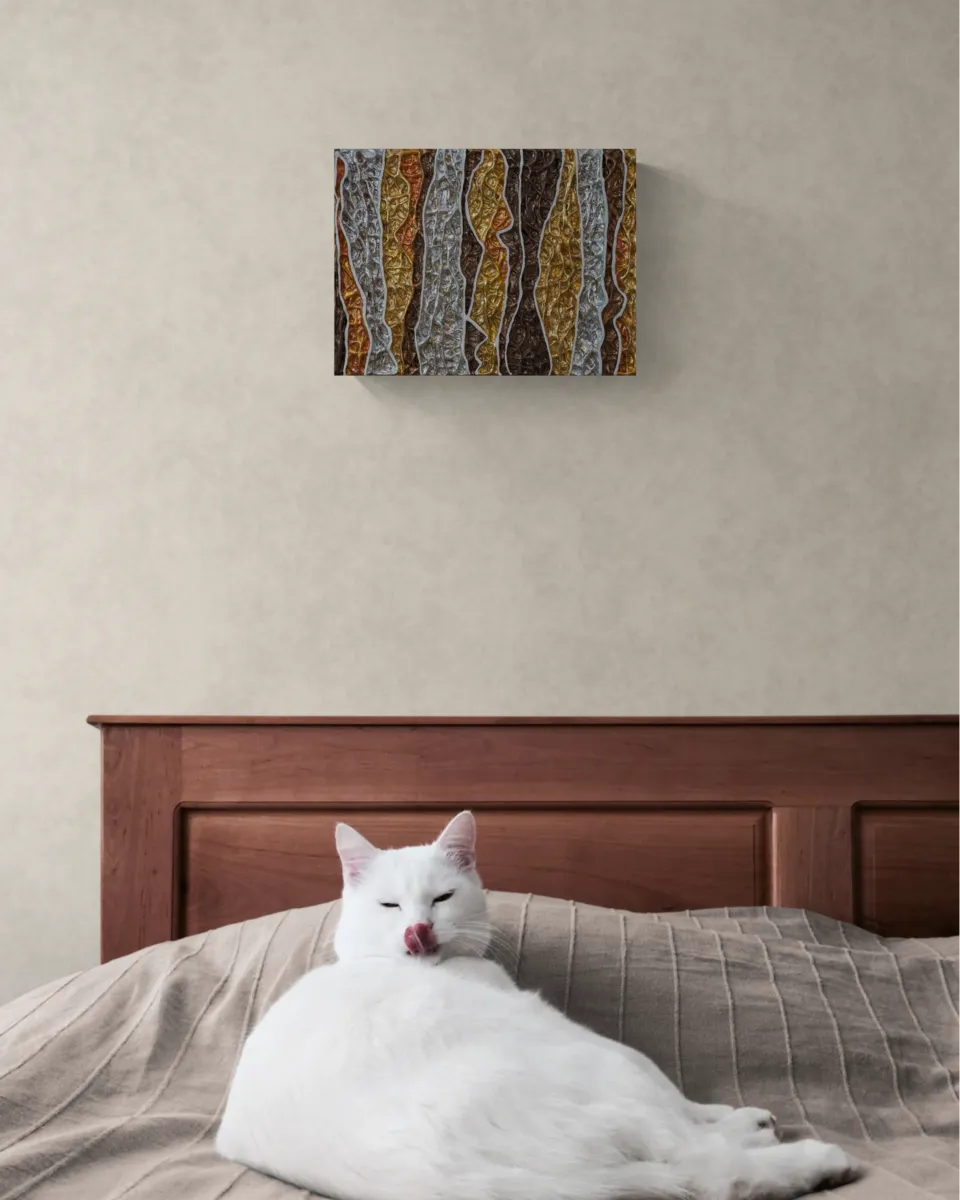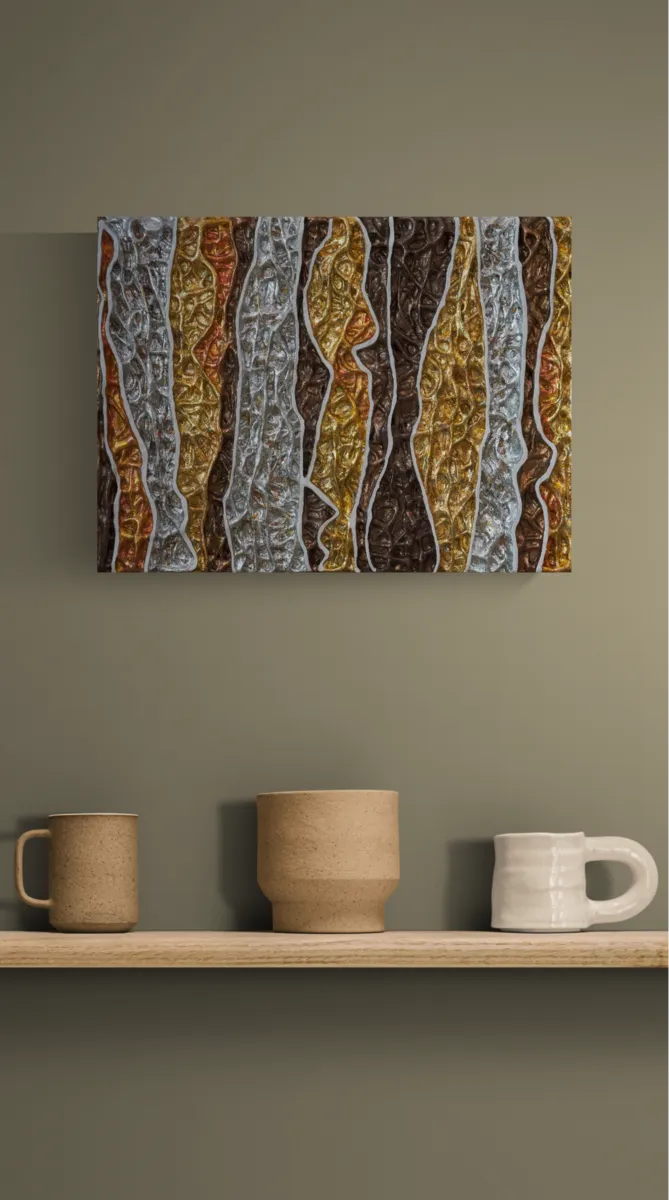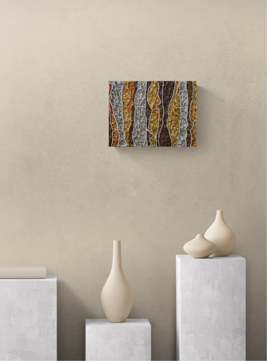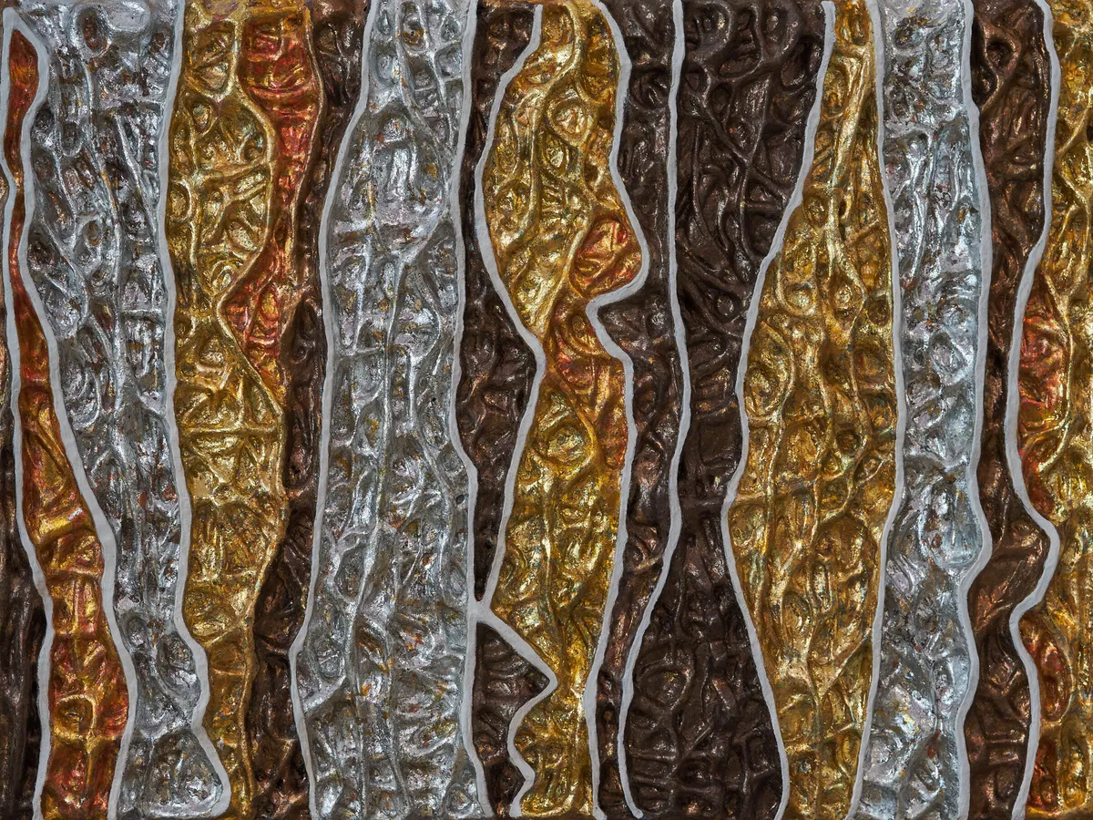 A mixed media work using texture to provide a sort of modern relief work, finished with a variety of oxidised gold, copper, and silver leaf. The work is 40x30cm and reaches a depth of around 4cm.