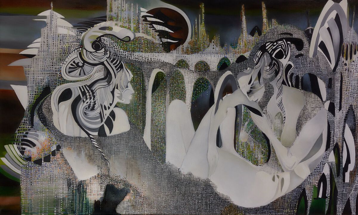 Before, in the dark, the echoes of the night resounded and, I found myself alone, and longing, and all so quiet. Now, here, together, we are entwined and and together in the light - my head-dress unfurls for you, my eyes alight. Your smile, it touches, it tenders. Deeply. *********** Adrianna worked on this painting over the course of countless months whilst living on the wild northern coast of Ireland. It is one of her earlier works, and one into which she clearly poured her heart and soul, and still brings her great joy after all these years. Adrianna feels that she was unwittingly preparing for the chance encounter that brought her together with her husband, that she was projecting a yearning for happiness and love. The artist hopes you can find this sensation within the work. *********** This highly detailed and intricate work is a large 150 x 90cm acrylic-on-canvas painting, mounted on 4cm deep stretchers. It is carefully finished with matt varnish and stored in proper conditions protected from dust. The poem for this painting was written by Adrianna's husband, Alex.