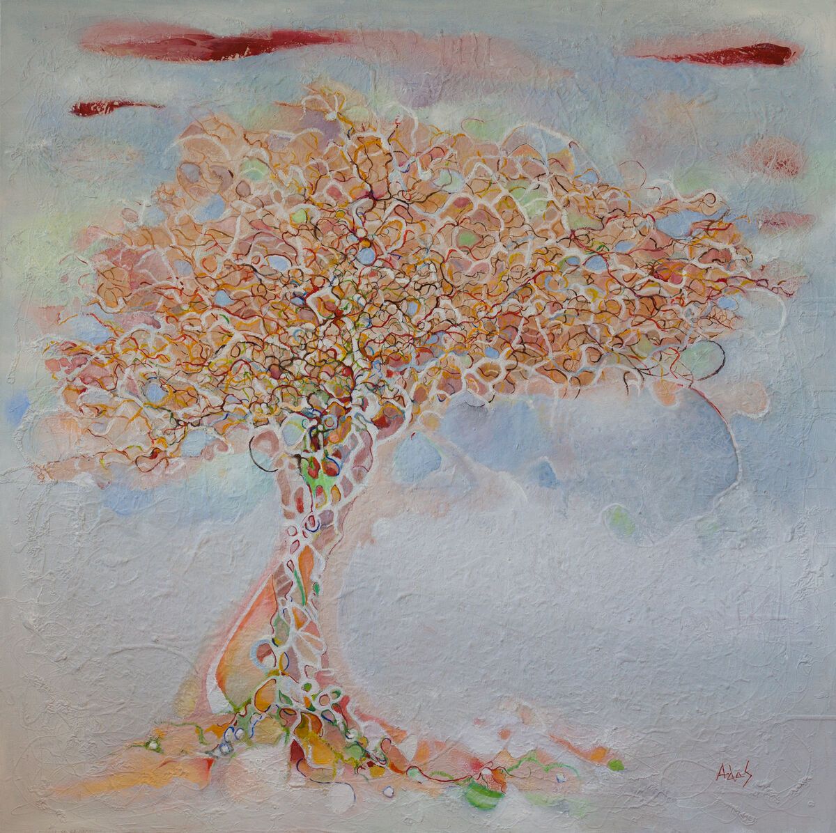 The recurrent theme of nature graces us again here, showing the artist's deep admiration and love of nature, and the peace that it brings her.