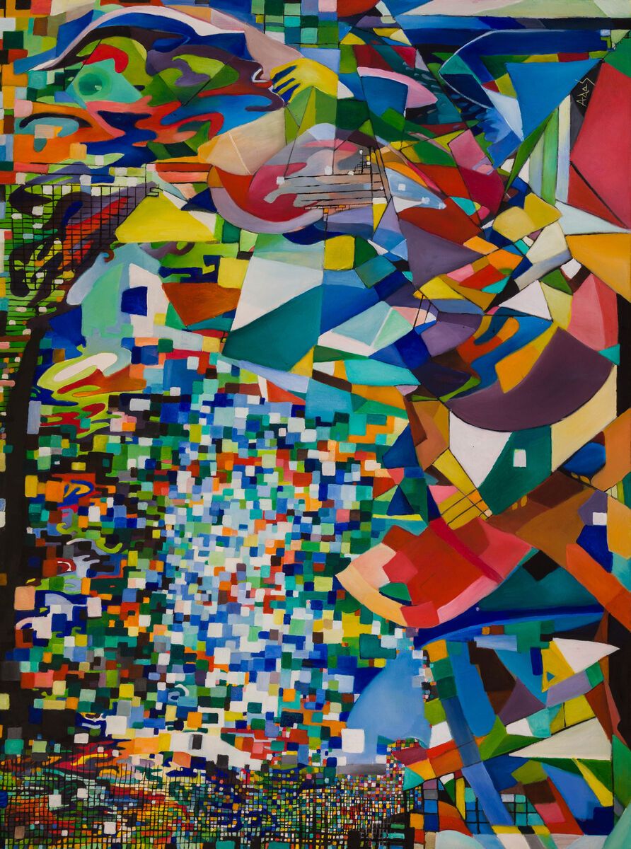 This wild scene filled with colour and playing havoc with perspective is heavily influenced by music, and on closer inspection abstract characters reveal themselves. This painting has also been designed to be hung either vertically or horizontally.