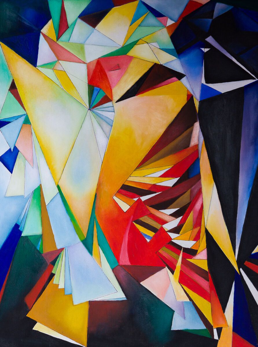 Despite its inherently angular nature, this beautifully, and joyfully, colourful work, manages to express the fluidity of the natural world through its detailed geometry. Painted with oil paint on a deep 3.5cm stretched canvas - the painting wraps around the sides of the canvas allowing the painting to be hung directly without framing.