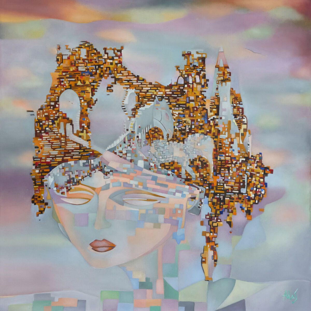 A beautiful subtle palette of colours lures the viewer in to the somewhat surreal world of this painting’s subject. Floating through a diffuse space, our central figure’s thoughts overflow and beguile. This work resides in a private collection in Cambodia. Painted with oil paint on a deep 3.5cm stretched canvas - the painting wraps around the sides of the canvas allowing the painting to be hung directly without framing.