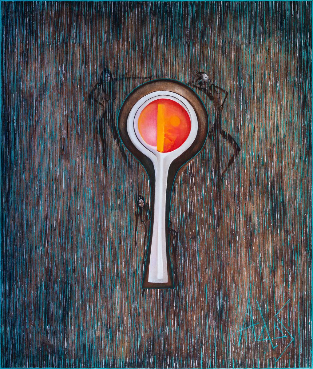 Here the artist revisits a concept from the previous year but this time with a substantially larger canvas. One has the sense of looking through a keyhole into the ‘other side’ where a very different scene is presented. Painted with oil paint on a deep 3.5cm stretched canvas - the painting wraps around the sides of the canvas allowing the painting to be hung directly without framing.