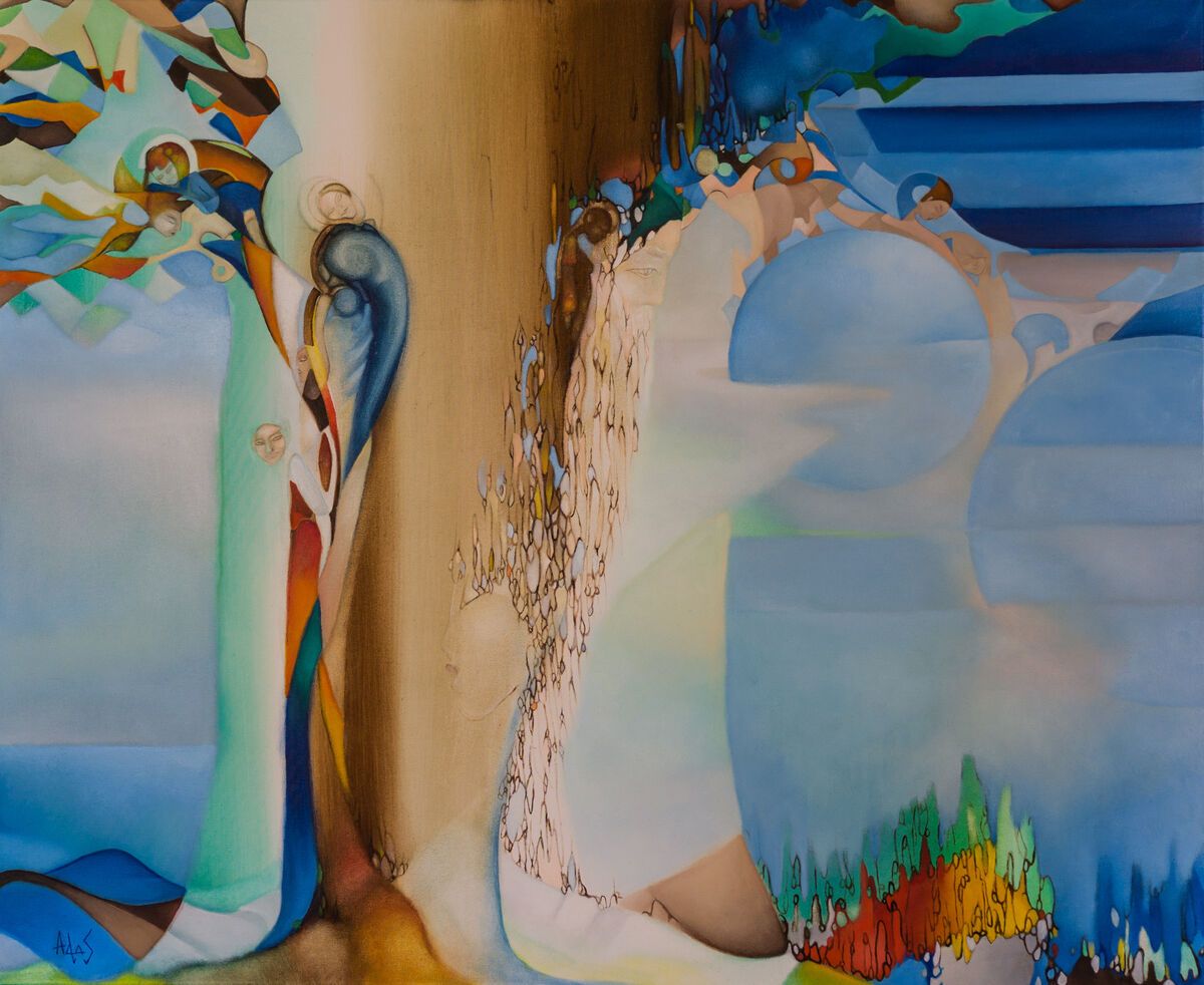 In this delicate and tender work, we find the artist experimenting with a much more subtle colour palette. Whilst it is an oil painting, it has a look reminiscent of watercolour, with gentle washes yielding to nebulous constructions and intangible figures. Painted with oil paint on a deep 3.5cm stretched canvas - the painting wraps around the sides of the canvas allowing the painting to be hung directly without framing.