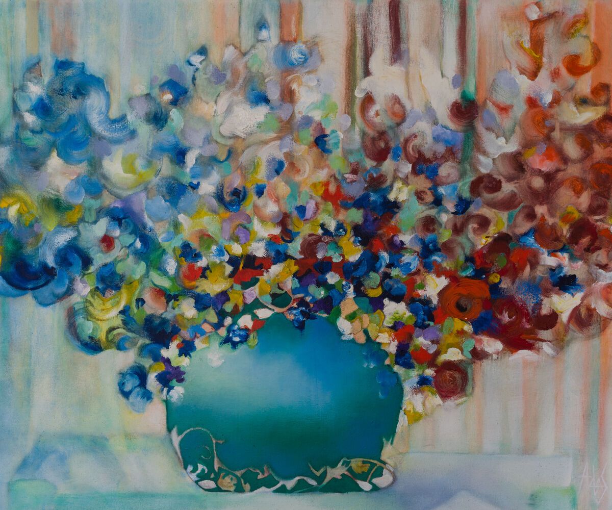 A unique take on a classic still-life subject, Adrianna’s interpretation of flowers in a vase overflows with simple pleasures at the colour, shape, and joy provided by these blossoms. Painted with oil paint on a deep 3.5cm stretched canvas - the painting wraps around the sides of the canvas allowing the painting to be hung directly without framing.