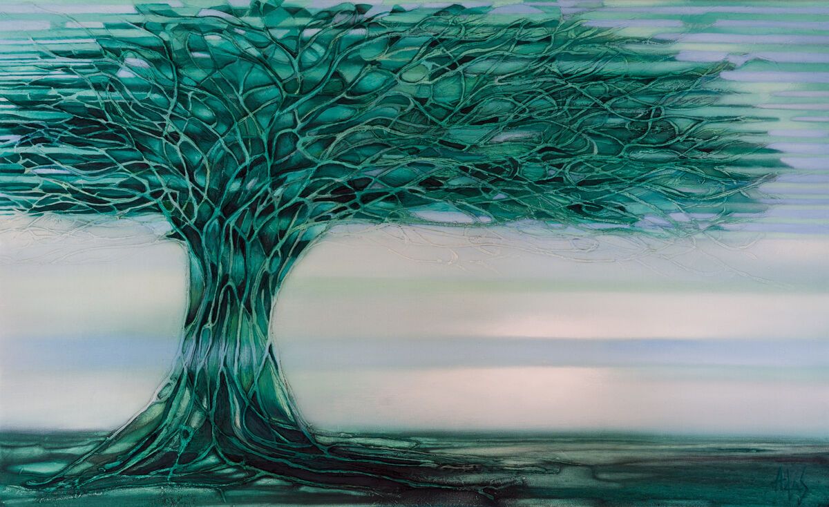 At once rich and minimal, this mixed media work utilises textures lines to map out the life-force of this lone tree in a vast landscape. The foliage blends into the air around, and the textured veins stretch deep into the land around merging off into the distance. Painted with oil paint on a deep 3.5cm stretched canvas - the painting wraps around the sides of the canvas allowing the painting to be hung directly without framing.
