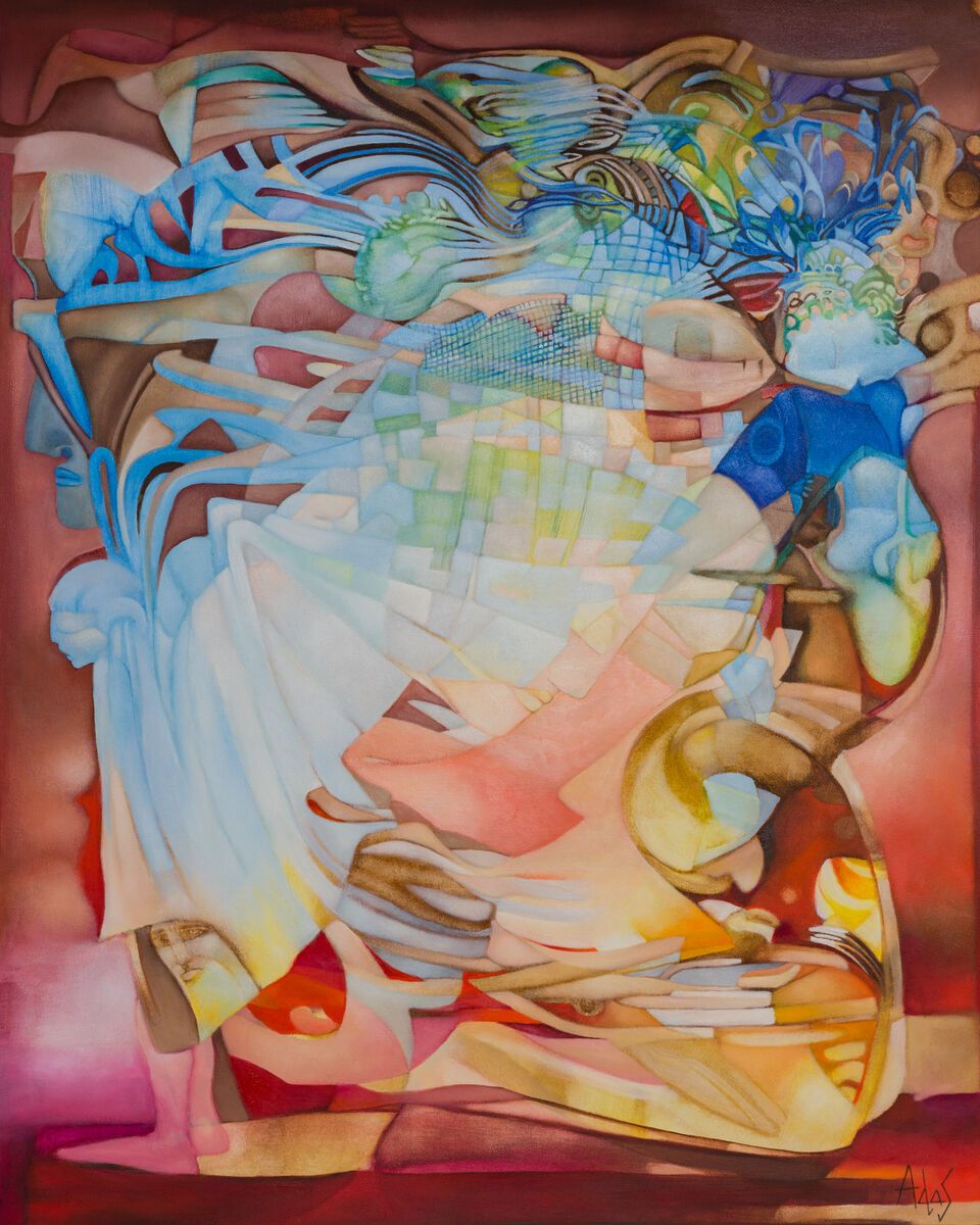 Painted for an annual showcase in Zakopane, Poland, this beautiful and vibrant work explodes with the artists interpretation of the angel-theme around which the showcase was based. The work may not fit into any traditional religious motifs, but it certainly overflows with spirit and soul. A wide cast of characters are represented and blend, lean, and flow into one other. Painted with oil paint on a deep 3.5cm stretched canvas - the painting wraps around the sides of the canvas allowing the painting to be hung directly without framing.