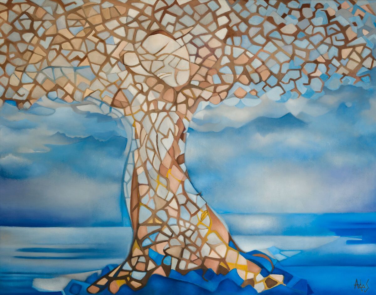 Taking inspiration from Darren Aronofsky’s 2006 film, The Fountain, this work looks tenderly at the themes presented by the movie - loss, bereavement, sorrow - but reframes them in a new light, wrapped within the life-giving tree, a vital and integral part of the whole, and one that transcends these hardships and can be seen with beauty and love. Painted with oil paint on a deep 3.5cm stretched canvas - the painting wraps around the sides of the canvas allowing the painting to be hung directly without framing.