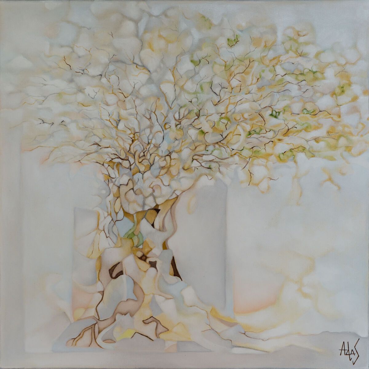 A frequent object of study and affection for the artist, this abstract interpretation of a tree is wonderfully subtle and calming. A muted colour palette draws us closer, pulls us in, and provides us with a viewpoint the exposes the pulses of life within the core; and again, as is often the artist’s way, integrates our own experience and life-force with that of the natural world. Painted with oil paint on a deep 3.5cm stretched canvas - the painting wraps around the sides of the canvas allowing the painting to be hung directly without framing.