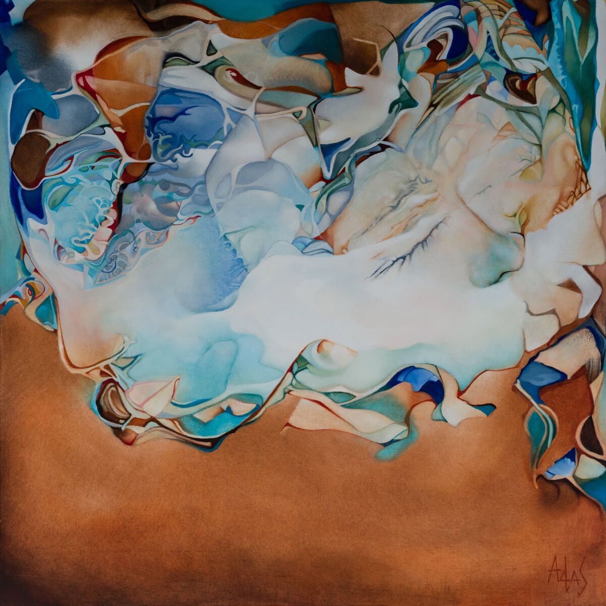 A beautiful abstract study, the artist has once again found a way to layer a wide and varied story into a calming visual feast. Perspective and intent merge, the fleeting and fractal nature of memory is explored, the ego and the id are exposed for us to view and consider. There is a strong sense of inner calm personified. Painted with oil paint on a deep 3.5cm stretched canvas - the painting wraps around the sides of the canvas allowing the painting to be hung directly without framing.