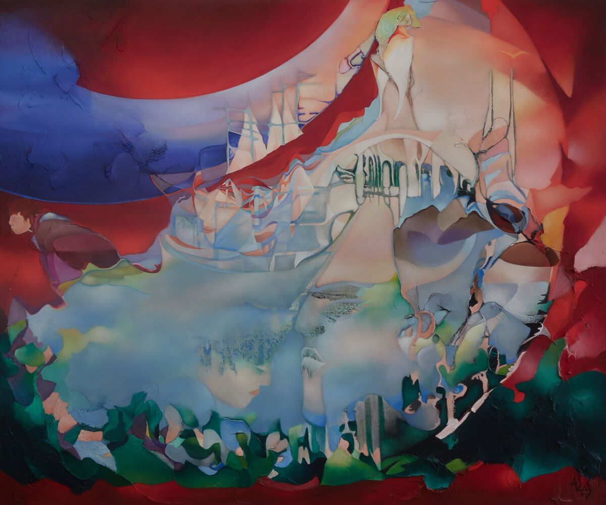An ethereal and intangible space invites us in here. One almost feels as though, through the use of the solid lines at either side of the work, we are looking through a door, or onto a stage - and the scene that is laid out before us most certainly has a cast of characters who flit amongst the clouds, relaxed and playful. Painted with oil paint on a deep 3.5cm stretched canvas - the painting wraps around the sides of the canvas allowing the painting to be hung directly without framing.