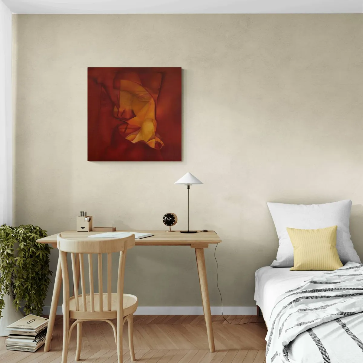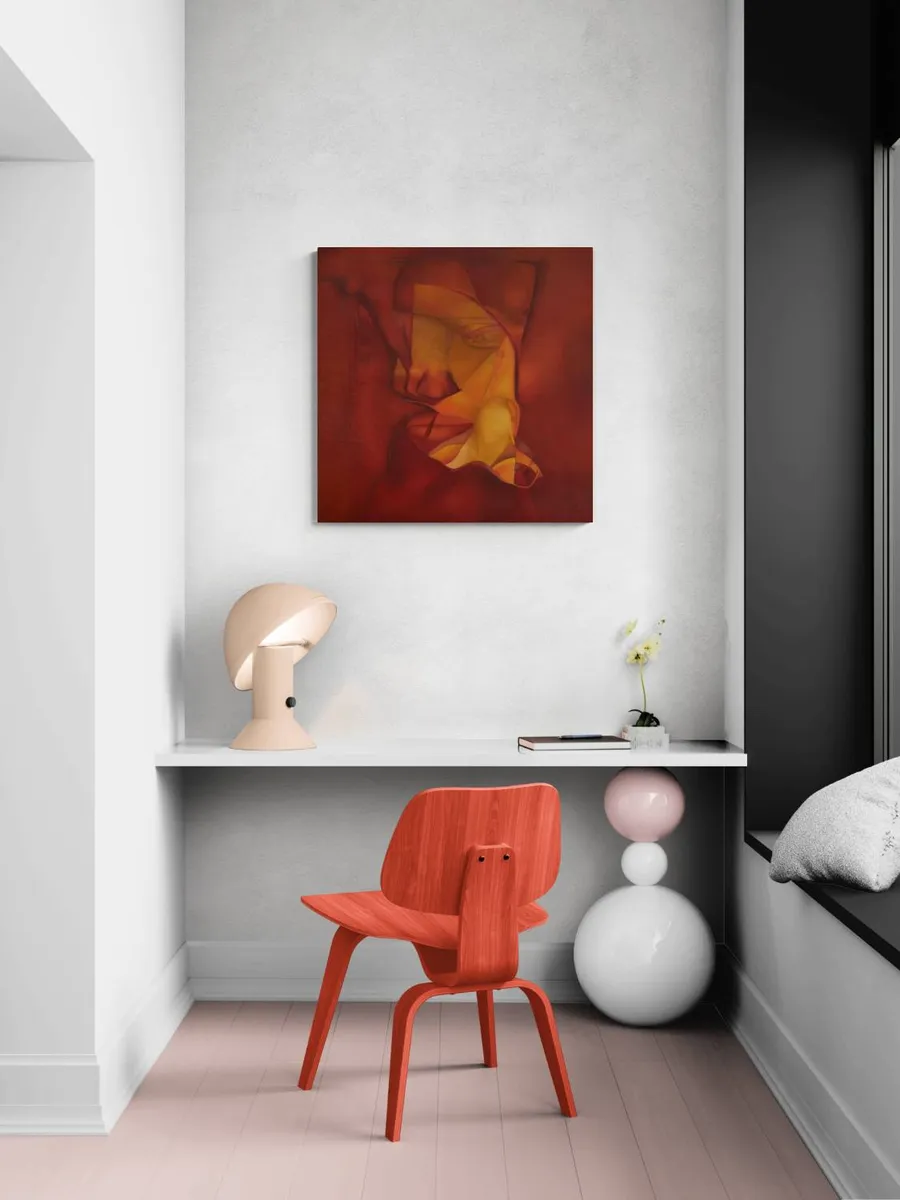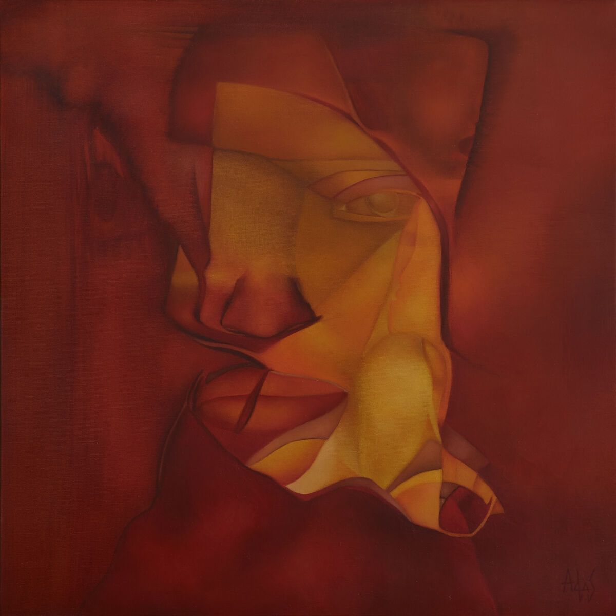 A relatively minimal departure, this work still manages to subtly incorporate multiple layers, interwoven and interacting. A figure meets our gaze eye to eye, and yet at the same time turns away from us, thoughts like an aura glimmer and flitter around, yielding a sense of what might be passing through the artists mind. Painted with oil paint on a deep 3.5cm stretched canvas - the painting wraps around the sides of the canvas allowing the painting to be hung directly without framing.