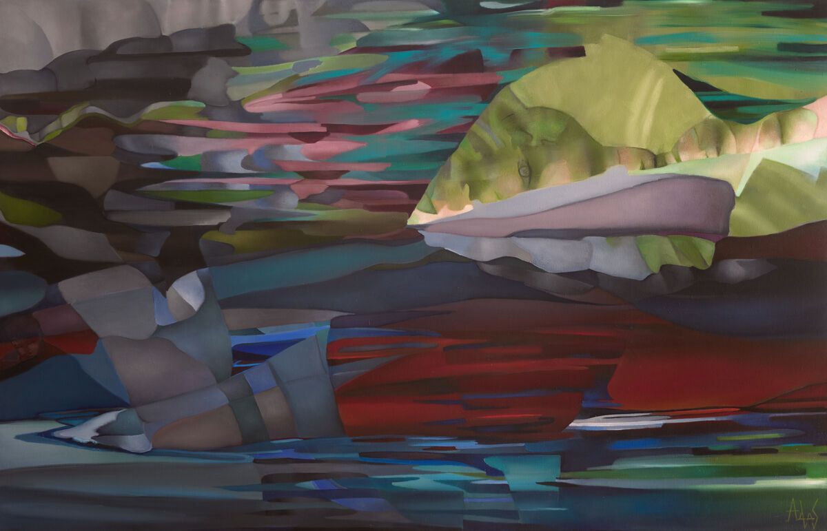 A very large 140x90cm canvas which plays with perspective and subject. Just as our focus settles on one view, another overlaps and draws in our attention. Figures seem to appear and slide away again, perhaps slipping into the flow of a river which reflects the light above, or the world around. Painted with oil paint on a deep 3.5cm stretched canvas - the painting wraps around the sides of the canvas allowing the painting to be hung directly without framing.