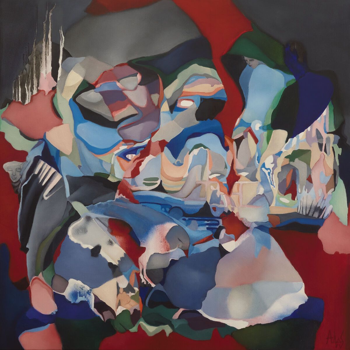 A fascinating abstraction morphing between landscape, macro, figurative - a veritable pantheon that draws the eye from one interpretation to another. Sold at auction by Stockholmsauktionswerk. Painted with oil paint on a deep 3.5cm stretched canvas - the painting wraps around the sides of the canvas allowing the painting to be hung directly without framing.