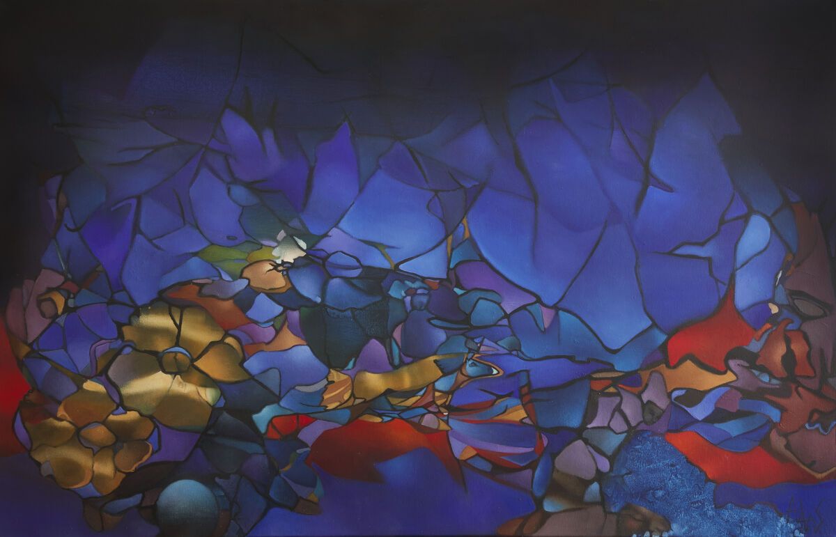 This large canvas hints at another world into which we have arrived and one through which we must travel. It is hard to tell whether it is night, or whether we are perhaps underground, in the midst of rock pools with motes of light reflecting azure into the cave. And whilst at first it may seem as though we must journey alone, we see there are characters we might meet, arrayed on the path in front. Painted with oil paint on a deep 3.5cm stretched canvas - the painting wraps around the sides of the canvas allowing the painting to be hung directly without framing.