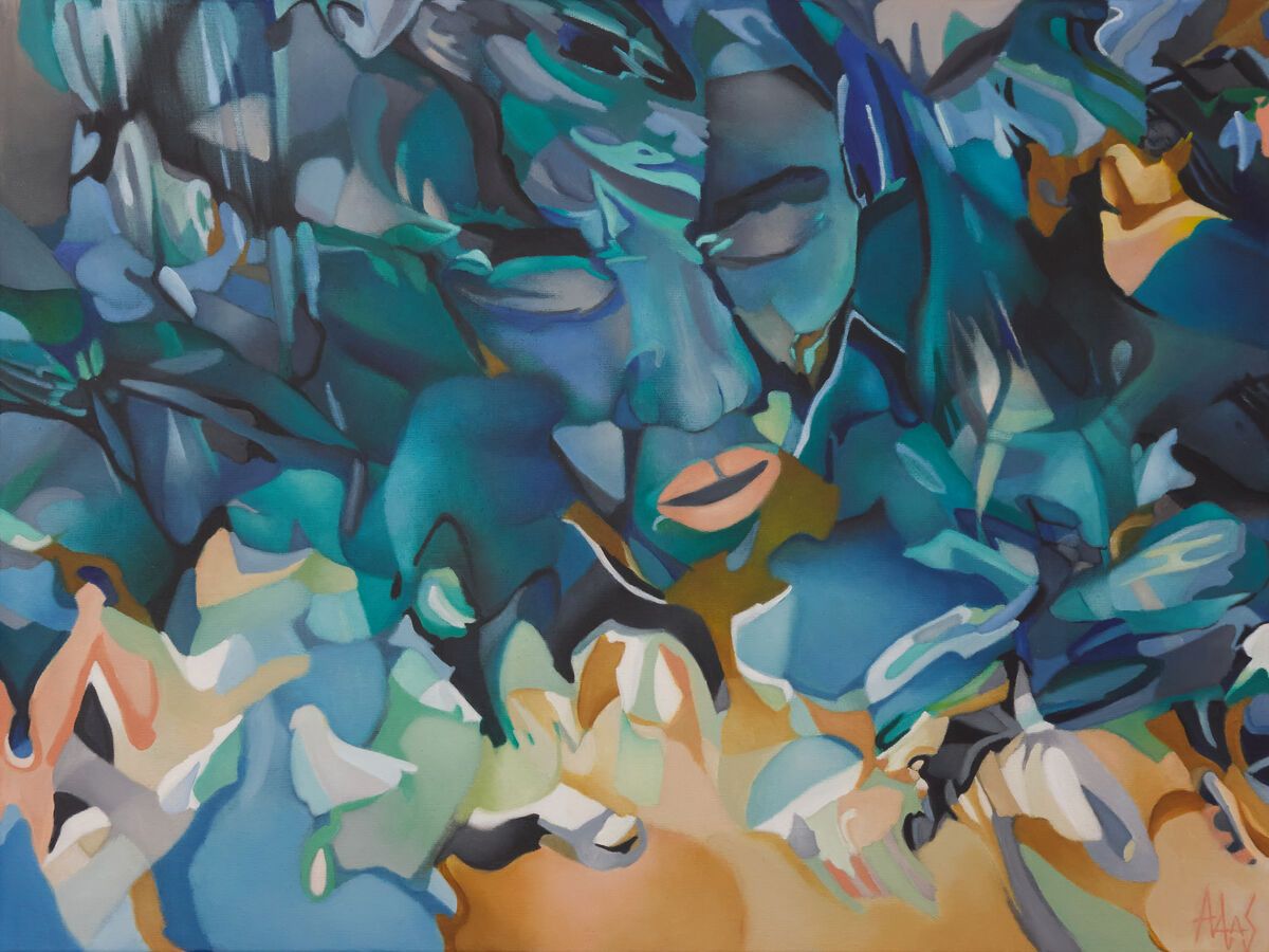This evocative abstract-yet-figurative work highlights once again the artist’s fascinating way of seeing the world; a canvas full of movement and layered interpretations of form and feeling. Foliage becomes sky, becomes rain, becomes human, becomes contemplation. Painted with oil paint on a deep 3.5cm stretched canvas - the painting wraps around the sides of the canvas allowing the painting to be hung directly without framing.