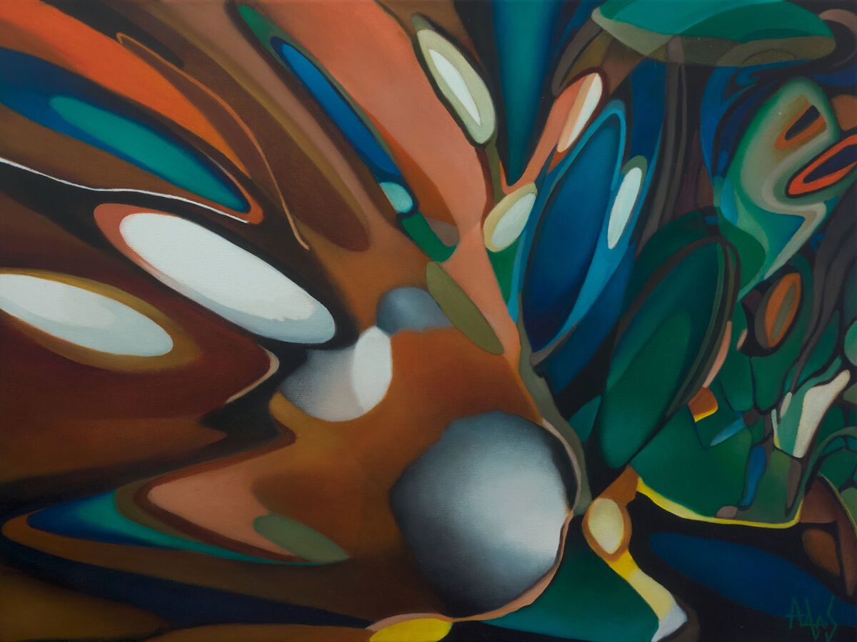 This beautiful exploration of form and colour is beguiling in its mystery. Adrianna has left scant clues in the work’s title, but it feels connected with one of her favourite subjects, that of nature. One can imagine the merger of a macroscopic examination of a butterfly with that of a wider scene with birds of paradise displaying in a lush forest. There is movement here, a natural flow - the eye finds itself drawn from place to place within the work. Painted with oil paint on a deep 3.5cm stretched canvas - the painting wraps around the sides of the canvas allowing the painting to be hung directly without framing.