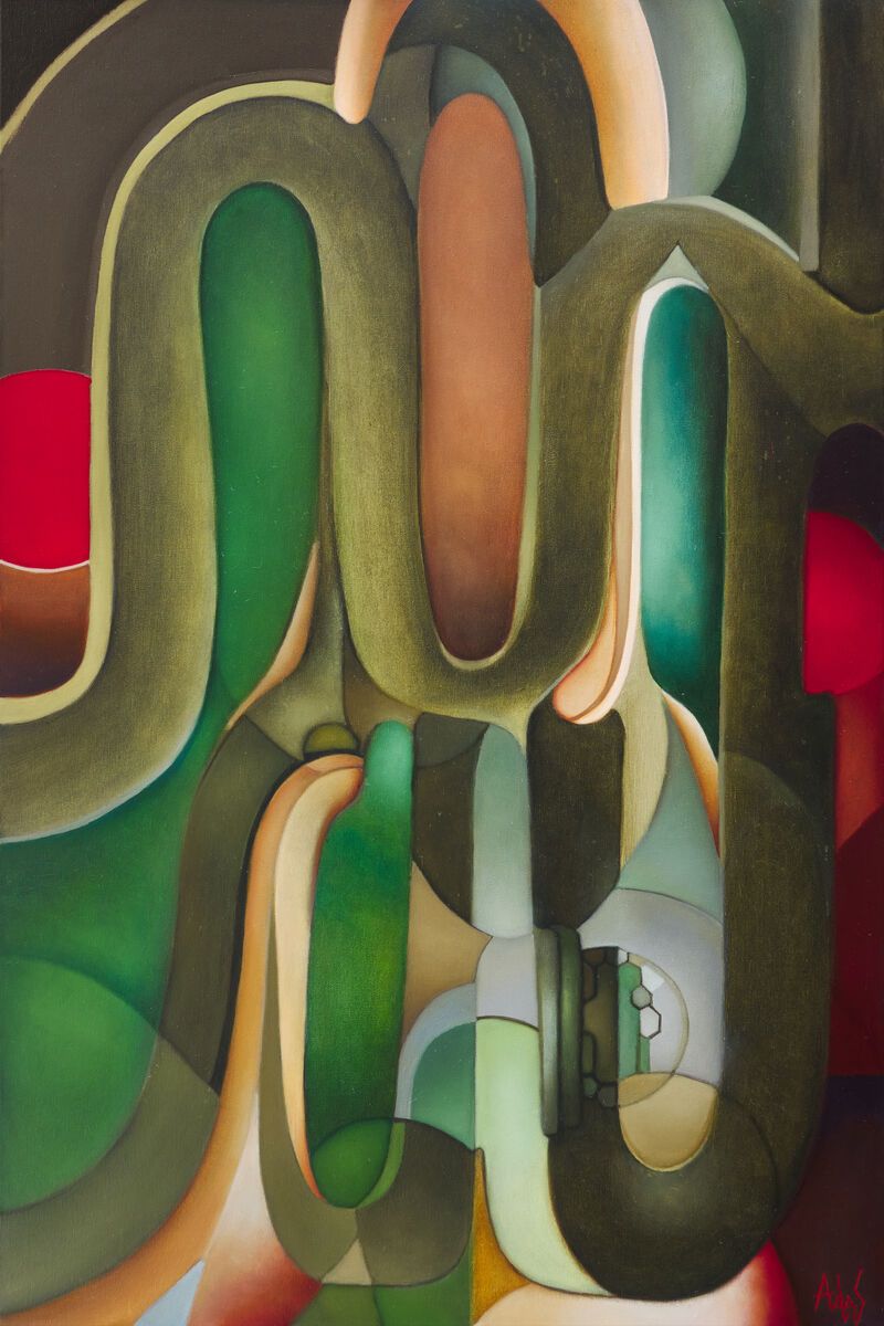 Painted across three canvasses with one 50x70cm canvas in the centre, and two 30x70cm canvasses at the sides, this vivid abstract work reminds us of the artist's earlier work "Formic Syntax", with a playful sense of movement and vitality. Each of the three canvasses are painted with oil paint on 3.5cm stretched canvasses - the painting wraps around the sides of the canvasses allowing the triptych to be hung directly without framing.