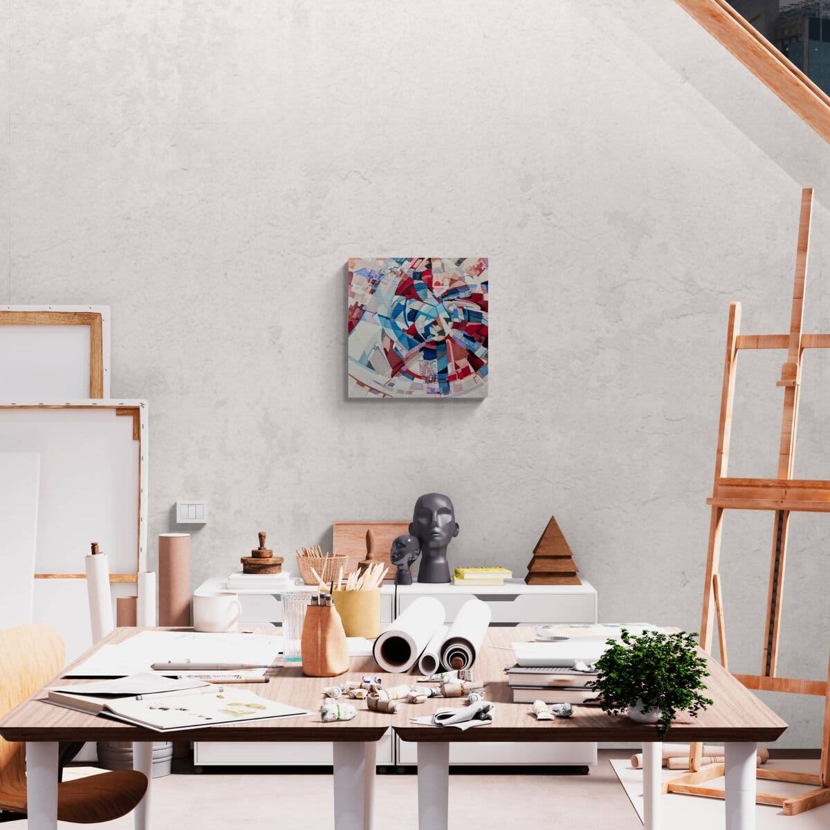 This beautiful abstract piece takes a detour from Adrianna's recent explorations, into a world more mechanical and defined. It feels like a maelstrom of activity, a spun city skyline; whirled into new visage, with one eye on both the destination and the path left behind. Painted with oil paint on a deep 3.5cm stretched canvas - the painting wraps around the sides of the canvas allowing the painting to be hung directly without framing.