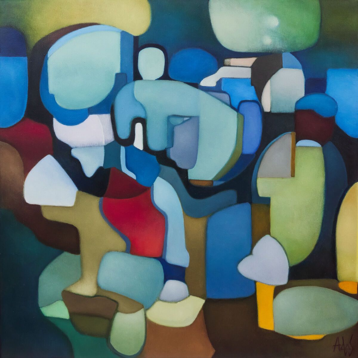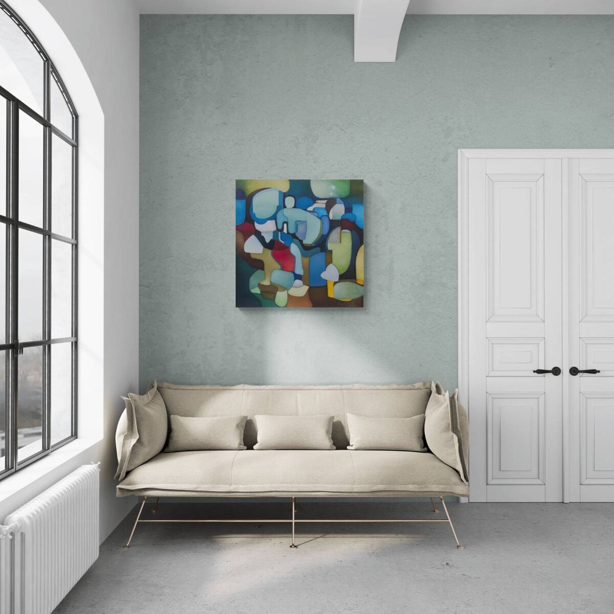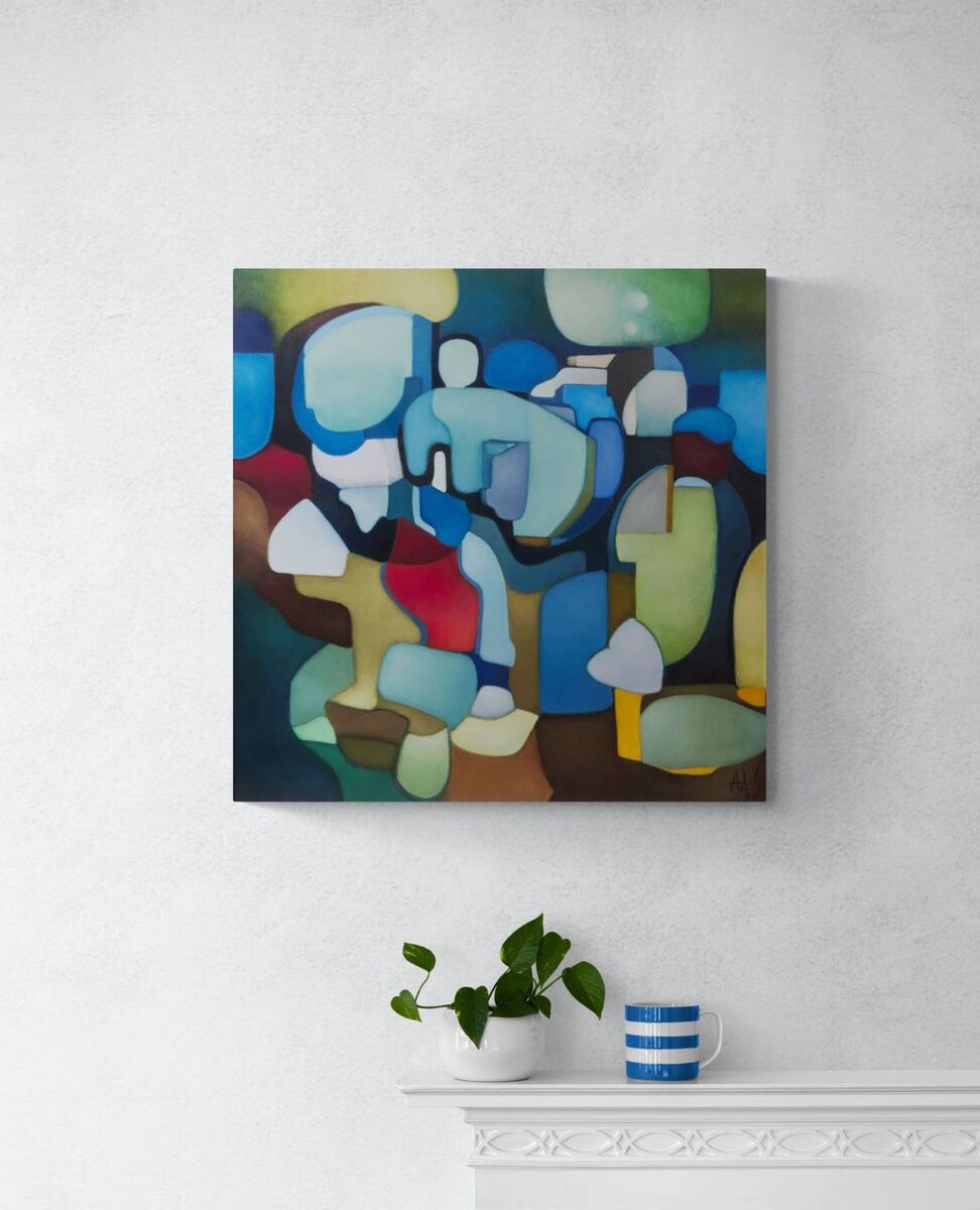 Sitting at an intersection of abstract and cubist, this painting's gentle pastel palette evokes a gathering of like-minded souls, at ease, perhaps convivial, under soft ambient lighting. Perhaps this piece could be considered a sibling to "Berlin Nights", painted the year before in 2021. Whilst this painting has a softer feel, it is easy to see a relationship between the two pieces. Painted with oil paint on a deep 3.5cm stretched canvas - the painting wraps around the sides of the canvas allowing the painting to be hung directly without framing.
