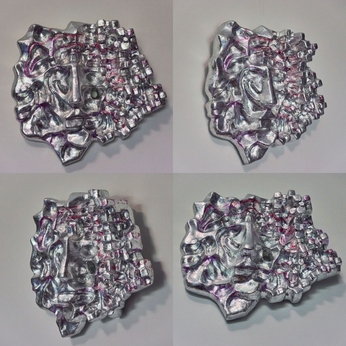 Carefully constructed out of a metal frame, covered with layers of lightweight plaster, this sculpture was then finished with silver and coloured metal leaf. Abstract faces interact and commingle before fragmenting and disappating. The sculpture is 31 by 30cm and reaches a depth of around 8cm. It is designed to be hung on a regular hook, similar to a painting.