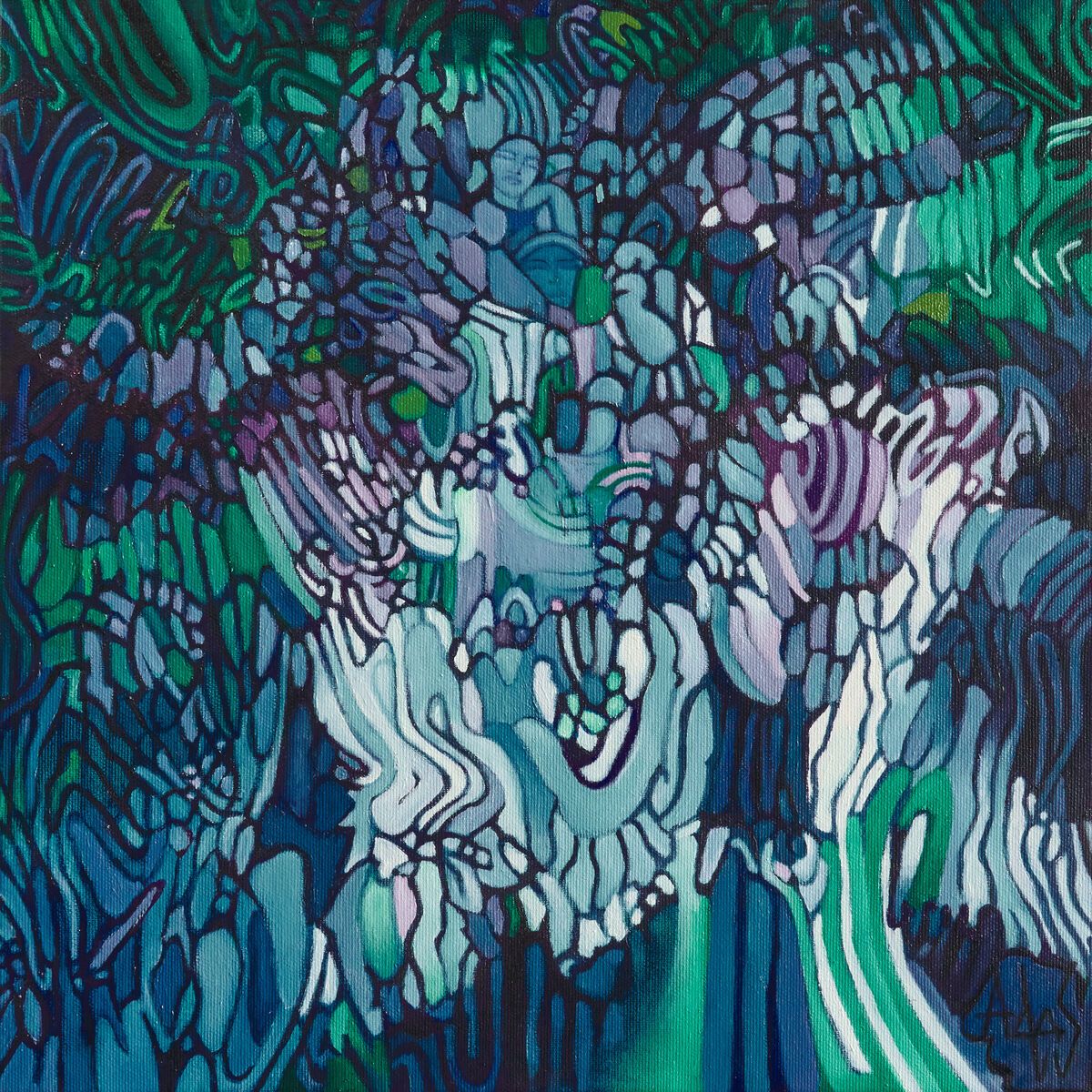 At the centre of this work, wrapped in the all-encompassing embrace of nature, of Mother Earth, lie two figures, content, protected, loved. Despite the relative 'coolness' of the colour palette, this work manages to feel warm and inviting. Painted with oil paint on a deep 3.5cm stretched canvas - the painting wraps around the sides of the canvas allowing the painting to be hung directly without framing.