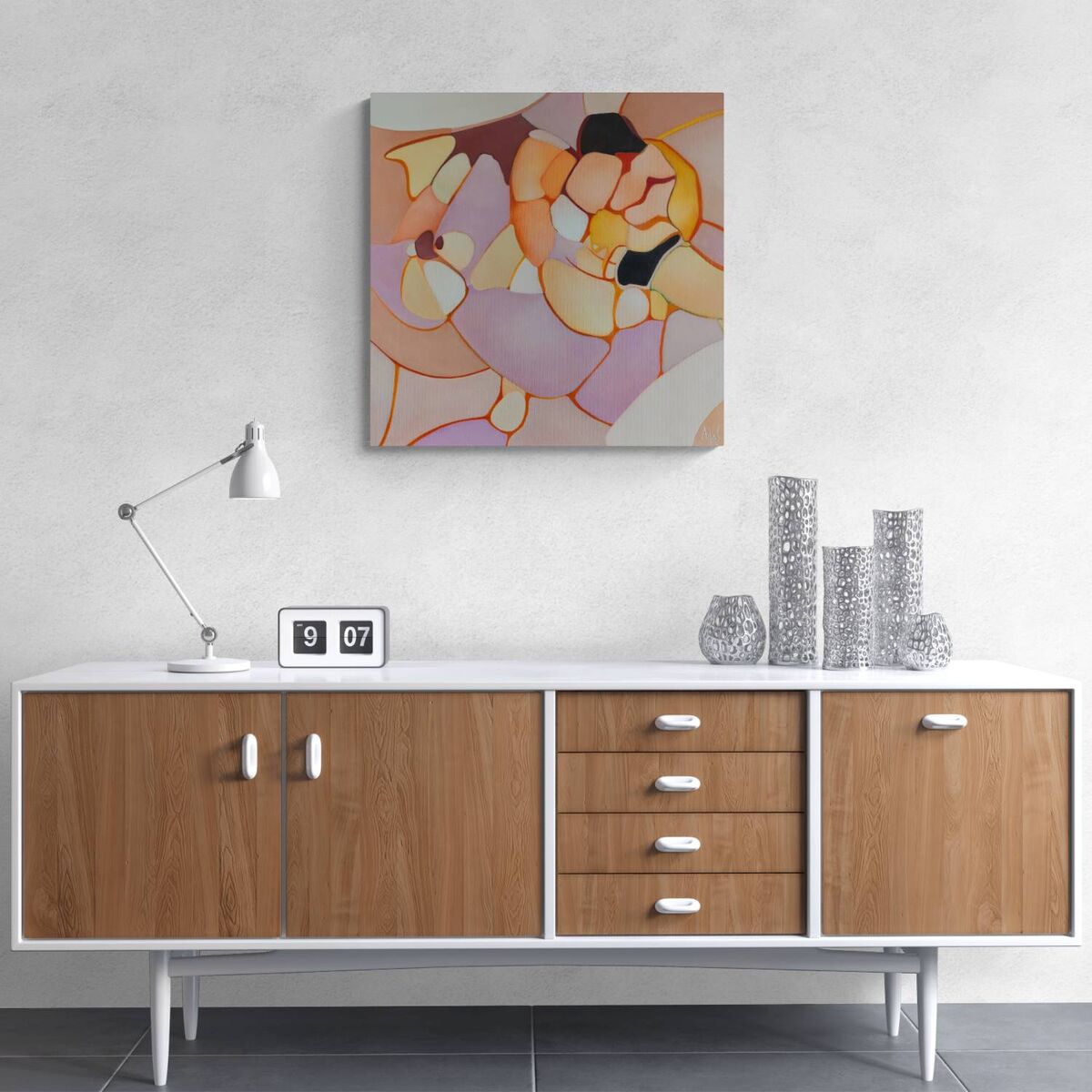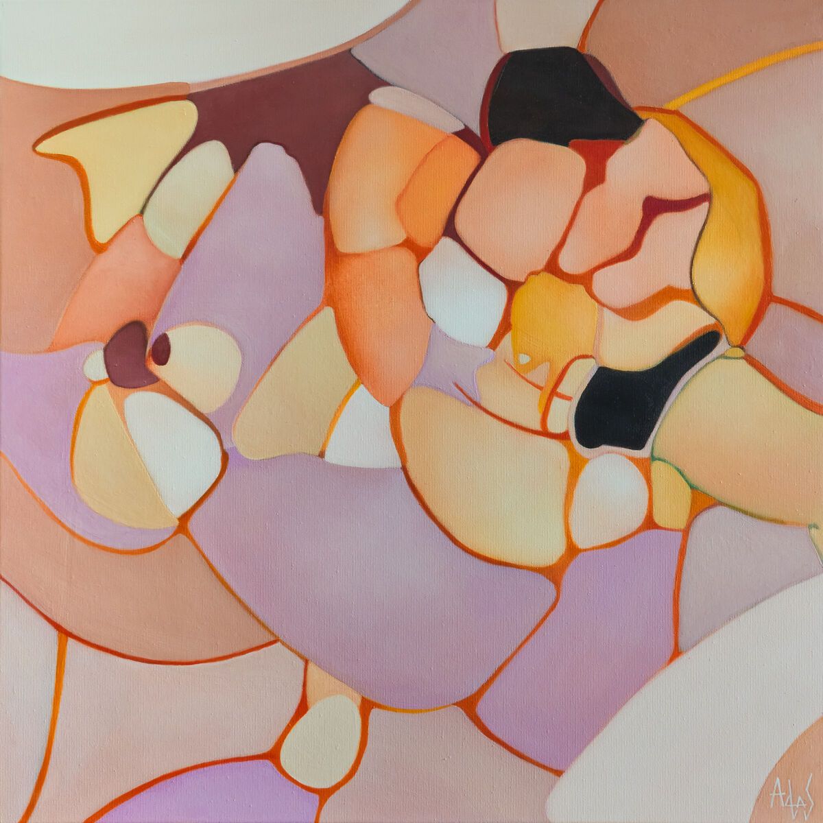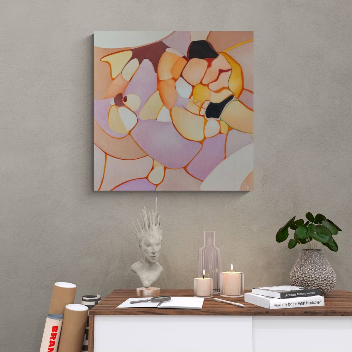Adrianna's continued exploration of abstraction continues with this piece. At first glance it appears to be nothing more than an exploration of shapes and tonality, but on deeper reflection there is a moment captured, perhaps between two lovers, with pastel skin tones abound, a flush rises, yearning, excitement even. Painted with oil paint on a deep 3.5cm stretched canvas - the painting wraps around the sides of the canvas allowing the painting to be hung directly without framing.