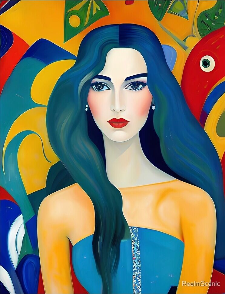 A painting of a woman in a blue dress, colorful portrait of Anahita, inspired by Persian goddess of fertility and water, large eyes and flowing long hair. Naive art. ⓘ My logo is not printed on products.